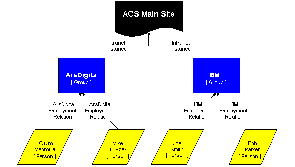 The Intranet application may model employees in many ways. Without loss of generality, we assume each employee is a "person" with an "employment relation" to a company. Figure 1 shows an outline of what the ACS Site Map may look like with several companies. Note that each company represents one instance of the intranet application.